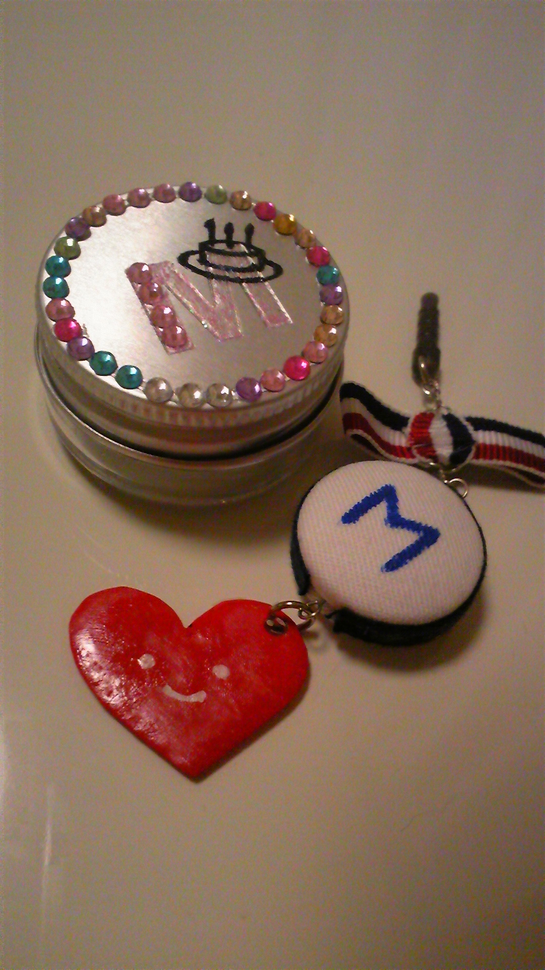 左上が自作のピルケース? 100均のクリームケースにMシールを貼り、マニキュアでバースデーハットを描き、周りにラインストーンシール貼りました。ちなみにまだ何にも使ってないww 使い道考えてから作れよww