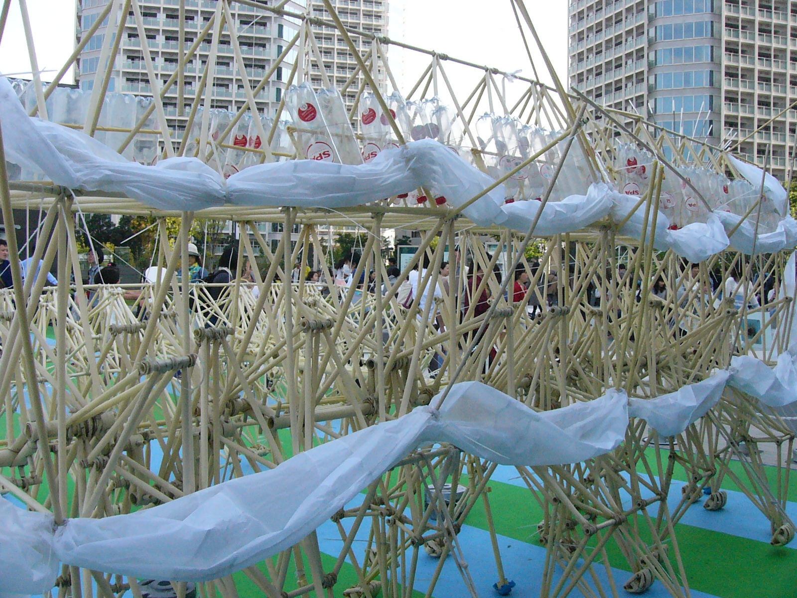 オランダの住宅やなんかで使われてるプラスチックパイプだそうです。実際近くで見ると、ぼろぼろで(笑) あと、結束バンド大活用! 風を受けるたてがみは、パイプ以上にぼろっぼろ。白いビニールを、透明のビニールテープで補強して補強して…って感じでした。補助空気を溜める(?)ペットボトルは、炭酸ドリンクに使うやつね。水やお茶に使われてるペラペラのやつじゃないよ。今の、底部分がポコポコ出っ張ってるやつもあったし、一昔(ふた昔?)前の、底が丸くて更にプラスチックの底がつけられてたタイプのもあった。(それのプラ底外して丸いままにしたやつ) ペットボトルロケット作るときに、これがいいんだよー、この古いタイプのが一番飛ぶんだよーと言われた話を思い出しました。
