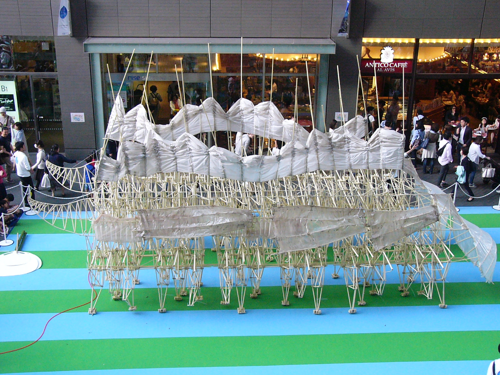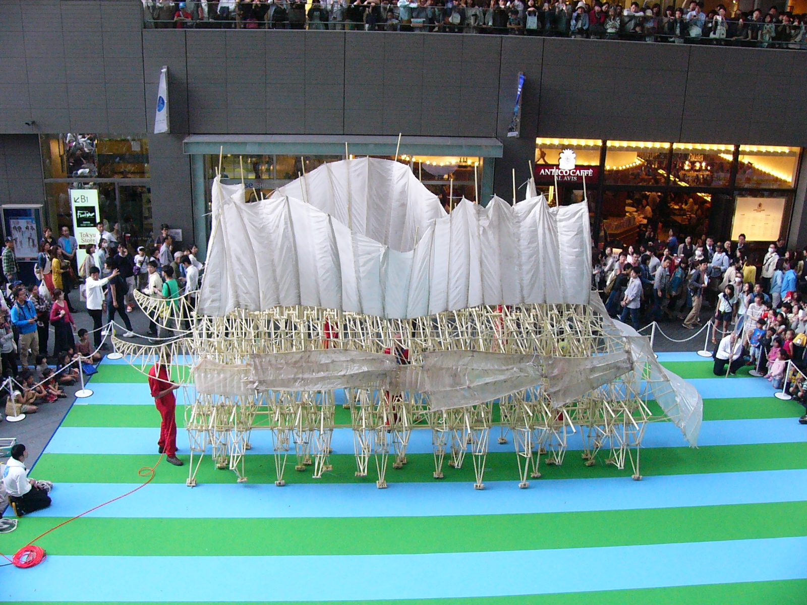 ”オランダの彫刻家テオ・ヤンセン氏が生み出した ”風を食べて動く” 巨大アート。作品「ストランドビースト」が二子玉川に出現!ガレリアや噴水広場会場では、実際に風力で動くデモンストレーションもご覧いただけます”というもの。