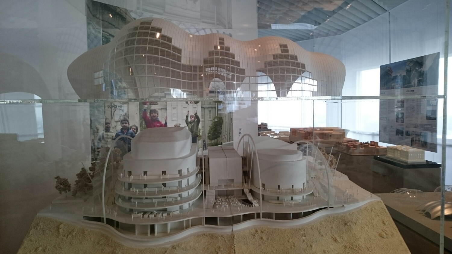 当然、入口に写真撮影に関しての案内があるので、確認しましたよ。それなのに、撮影しながら展示を見ている最中、年配の男性がキュレーターに「ここは写真撮っていいのかね?」って聞こえよがしに尋ねてて…カチンと来ました。うーん、まぁ、あれくらいの年代の方だと、きっと写真OKの展覧会にはあまり行かれないんだろうなぁ…結局その後、私のより数倍よさそうな一眼レフでバシバシ撮られてましたよ。建築模型が多かったので、キュレーターさん(ただの見張り?)も多かったです。