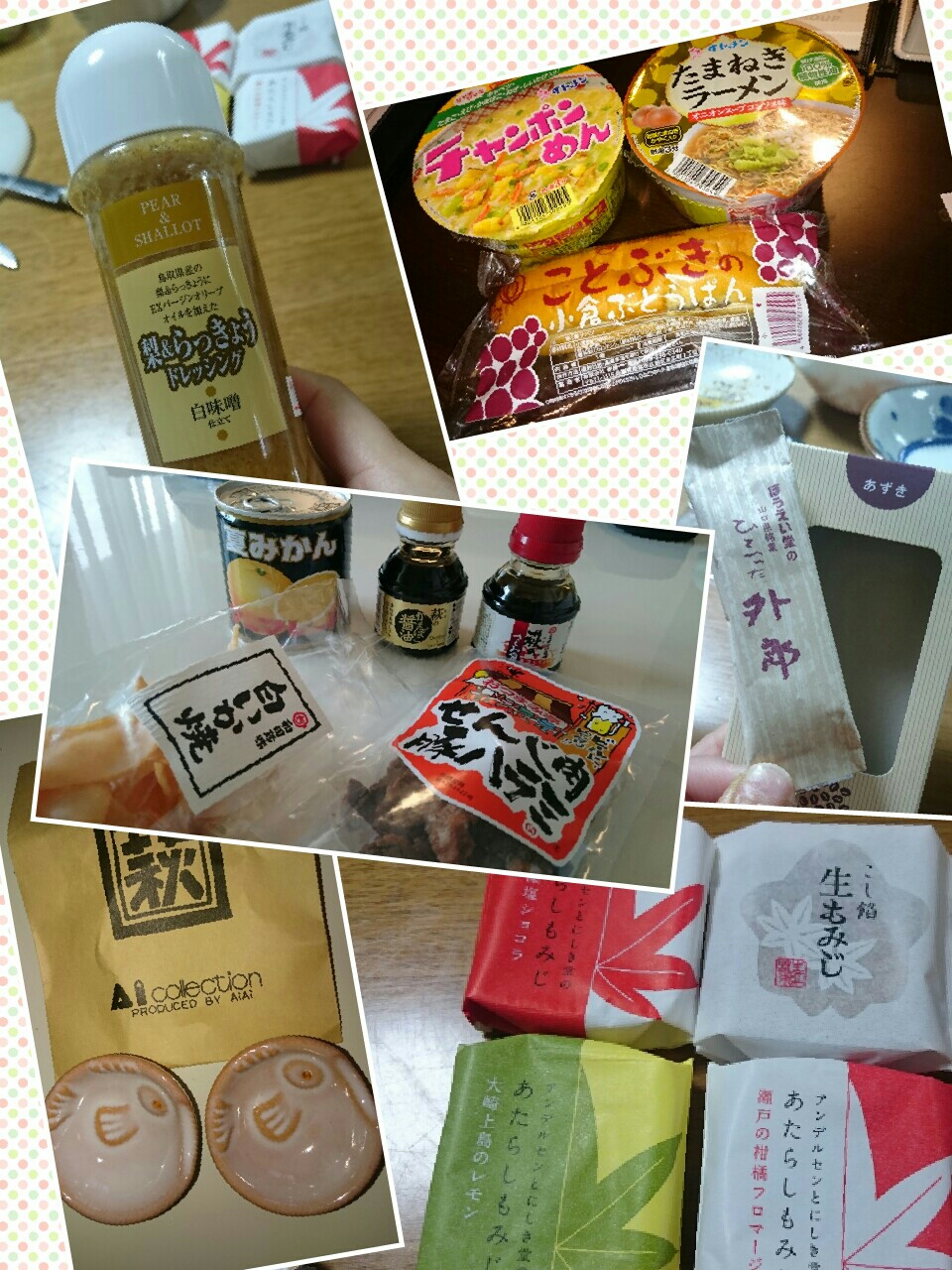 左上:鳥取の梨しょうがドレッシング 右上:姫路のご当地フード? イトメンのカップメンと、コトブキのコッペパン