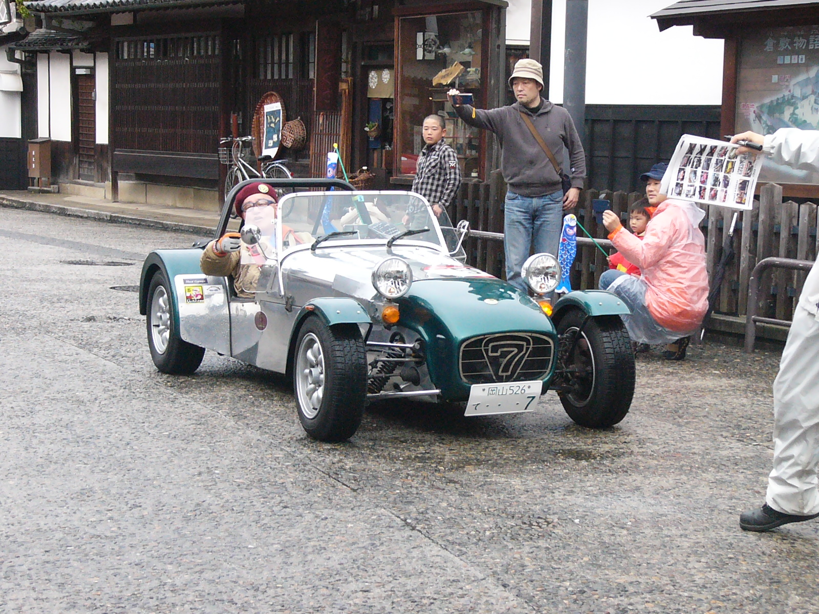 ひーひー言いながら再び美観地区を目指していると…なんか…妙に、クラシックカーが多いな?? コンビニ前にも停まってるし、さらにそれを追い抜いて2台…3台と…しかもみんな車体の横に、番号を付けてるのですよ。