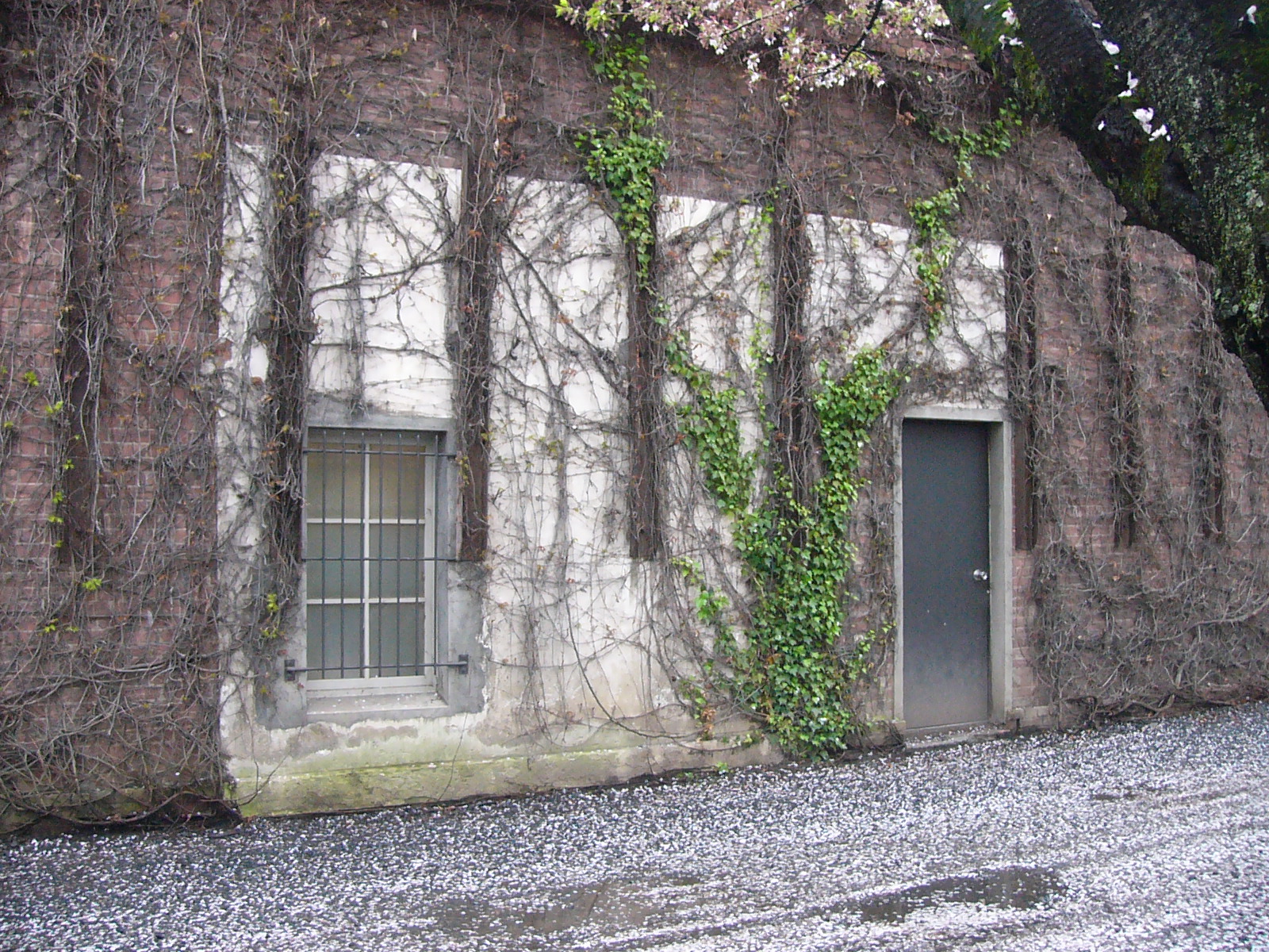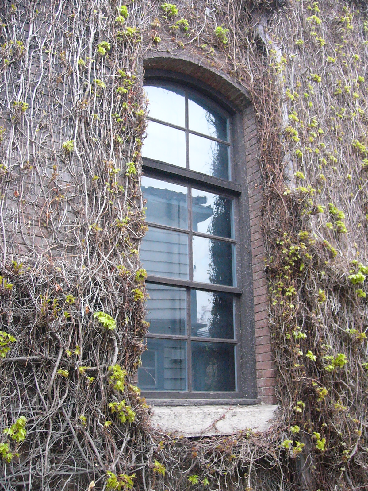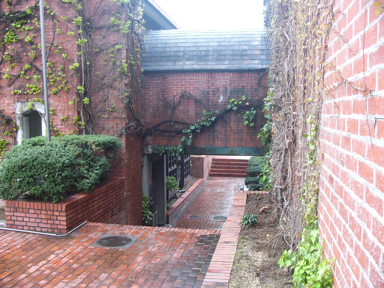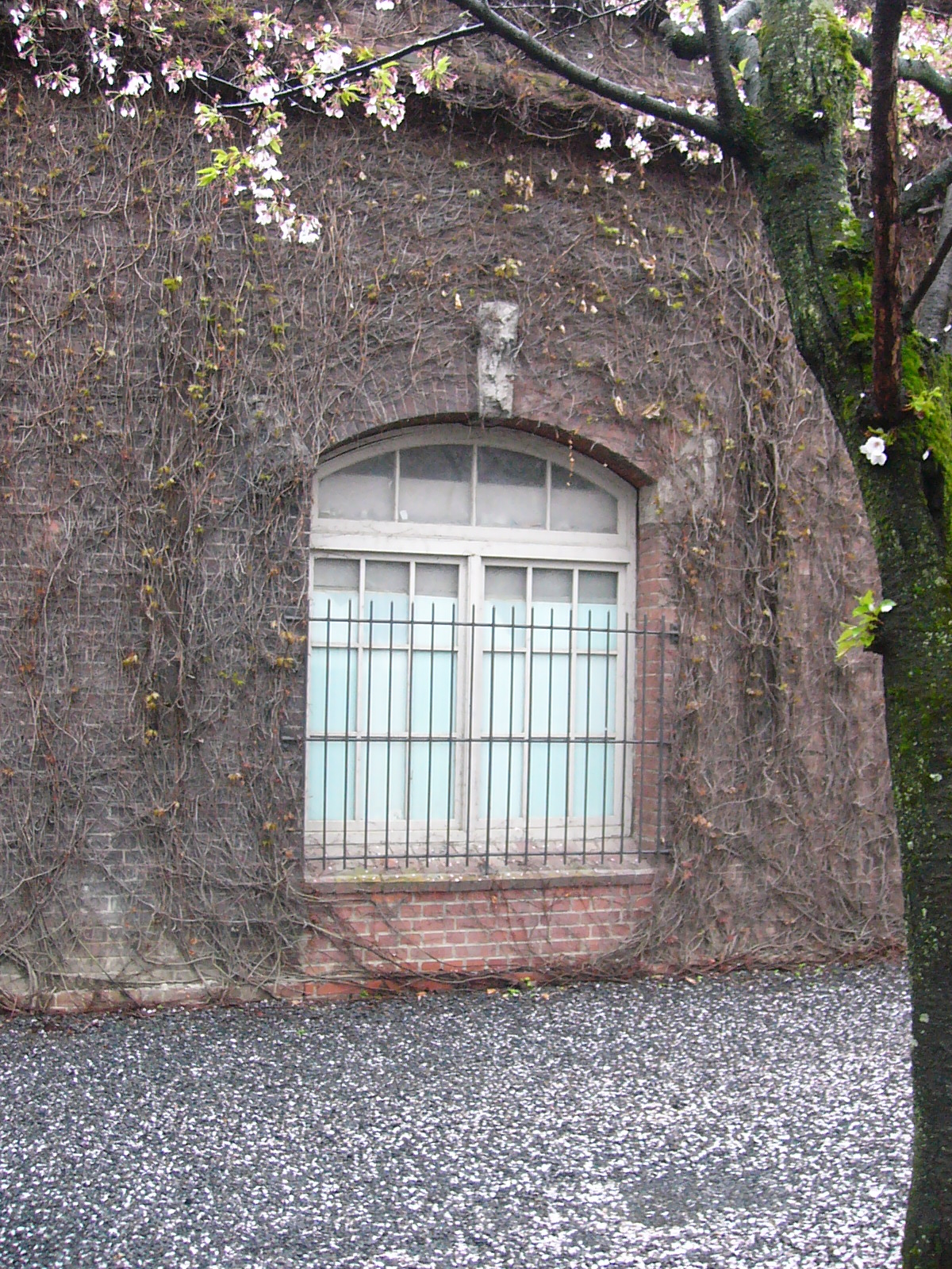 順に、敷地内桜並木・並木側の窓・外壁・たぶん中庭・中庭・中庭から正面へ抜ける通路・アイビー学館の外窓。
