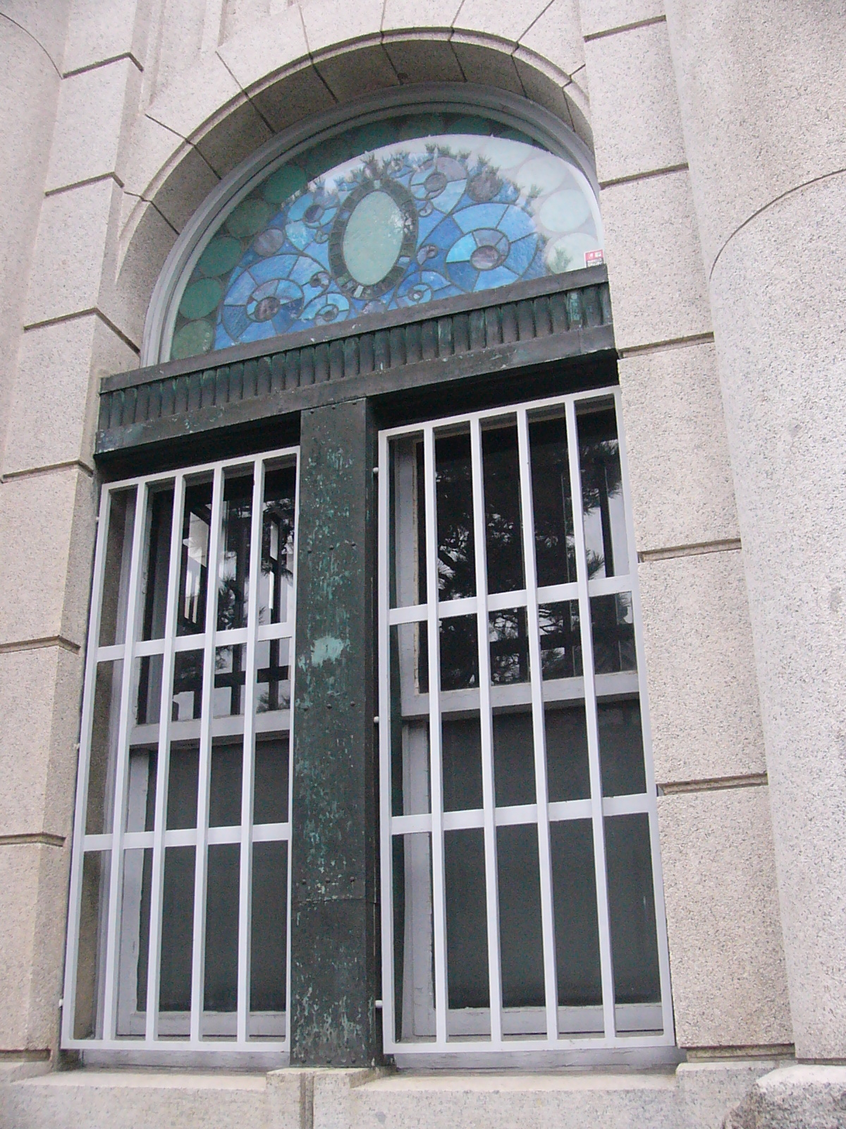 右2枚:倉敷公民館と建物側面の窓。服飾系の専門学校の入学式をやっていたようです。こんな雰囲気のある公民館いいなー。こういう建物の側面の窓もいちいち素敵。