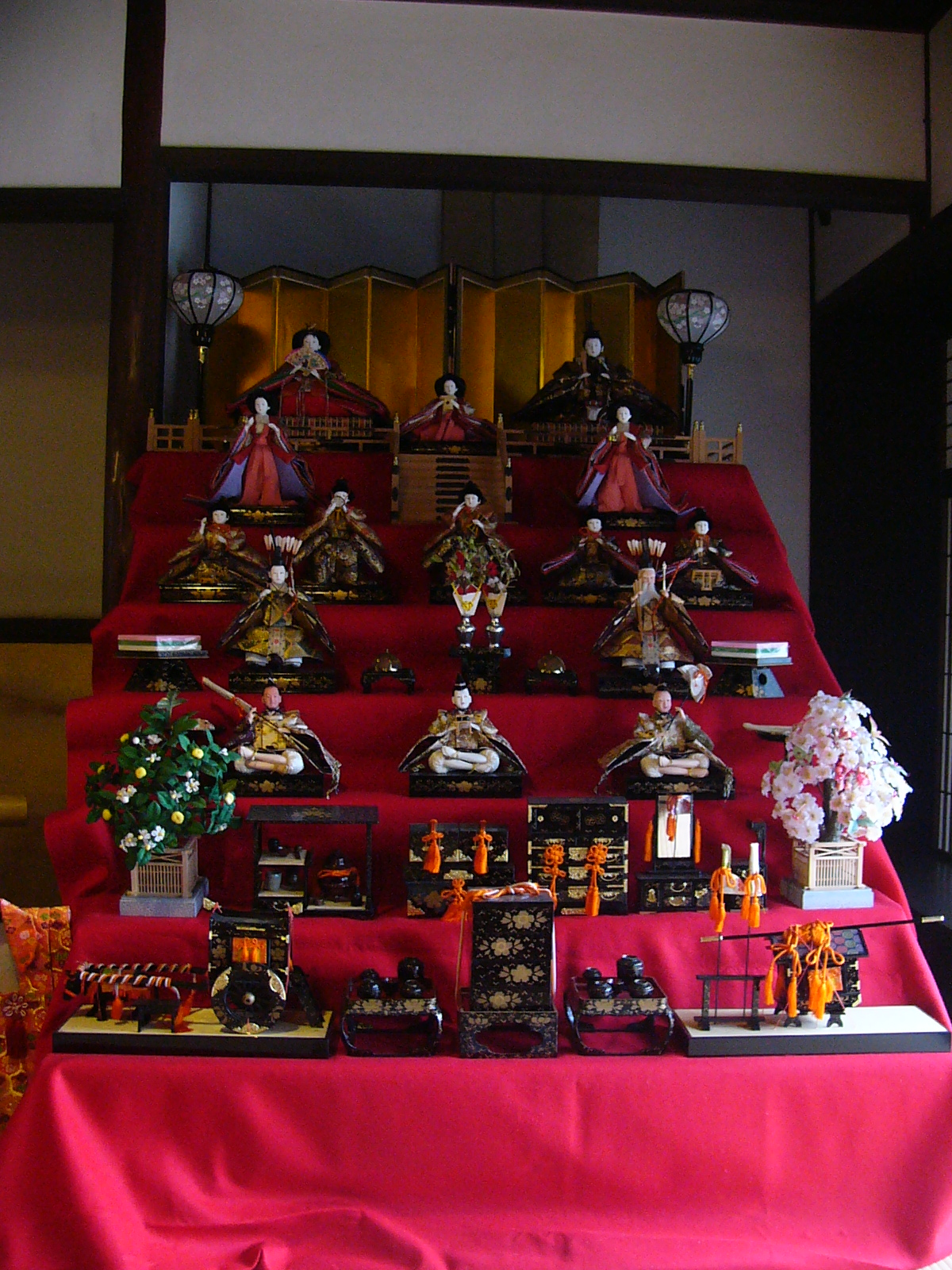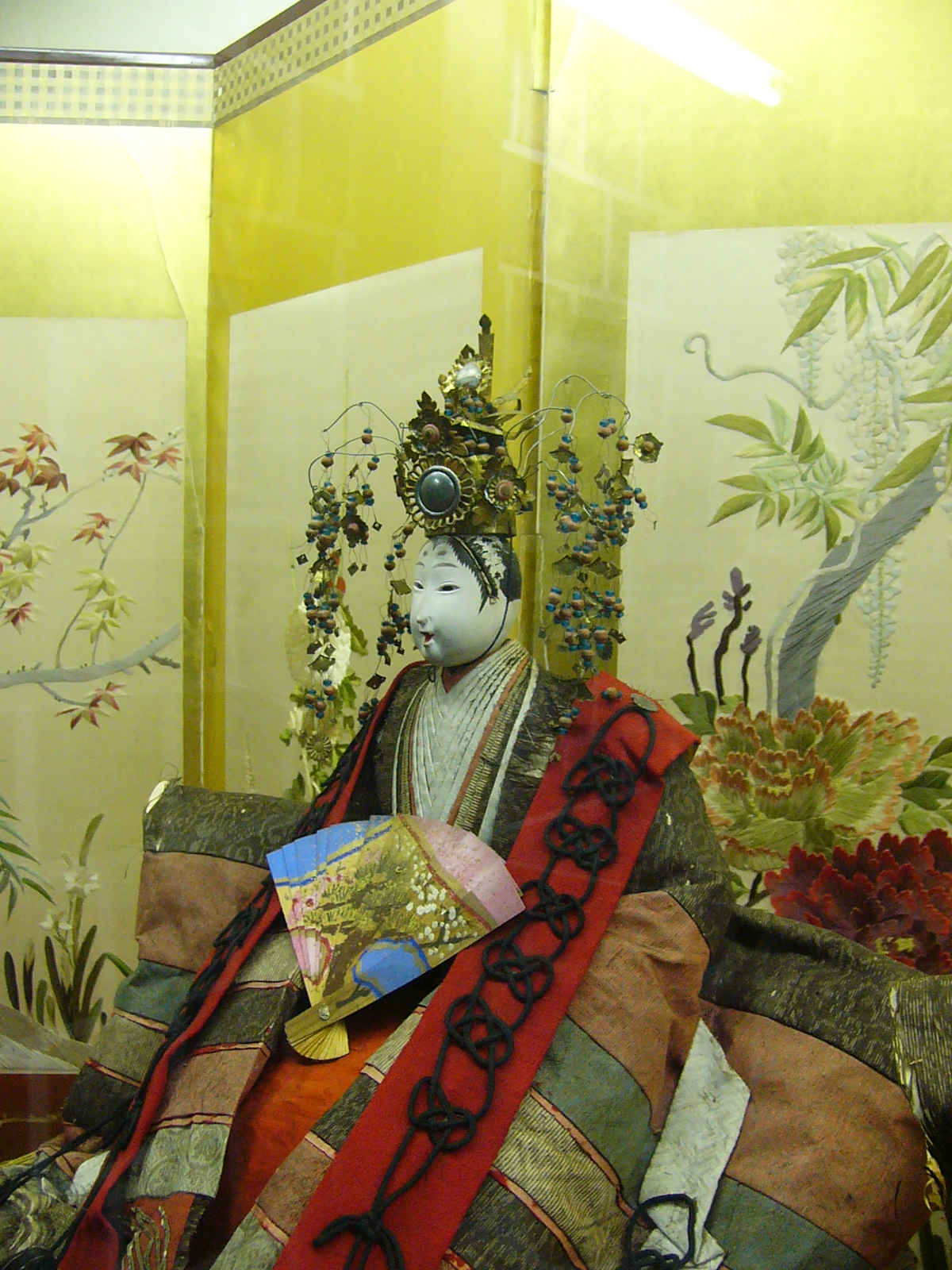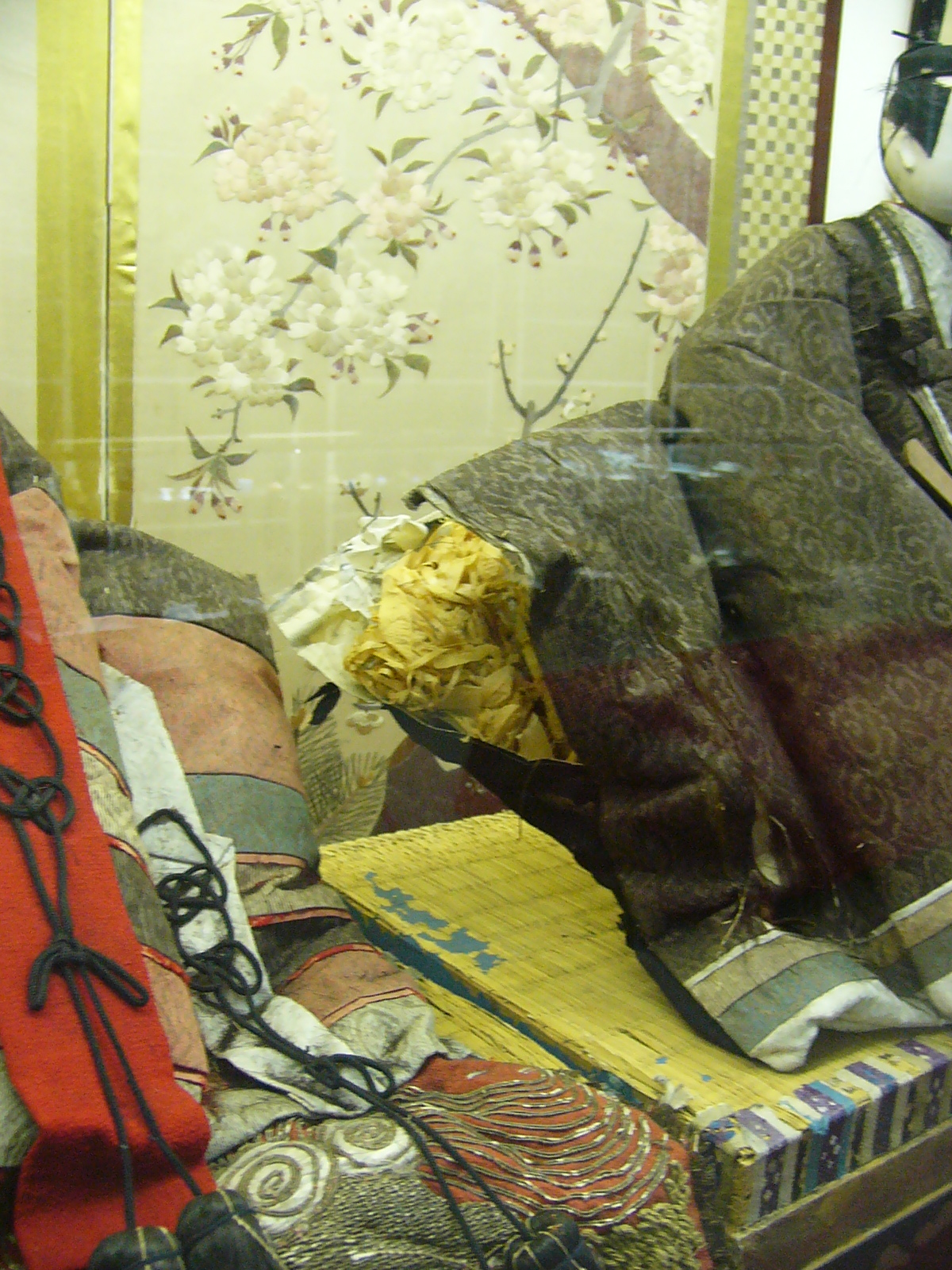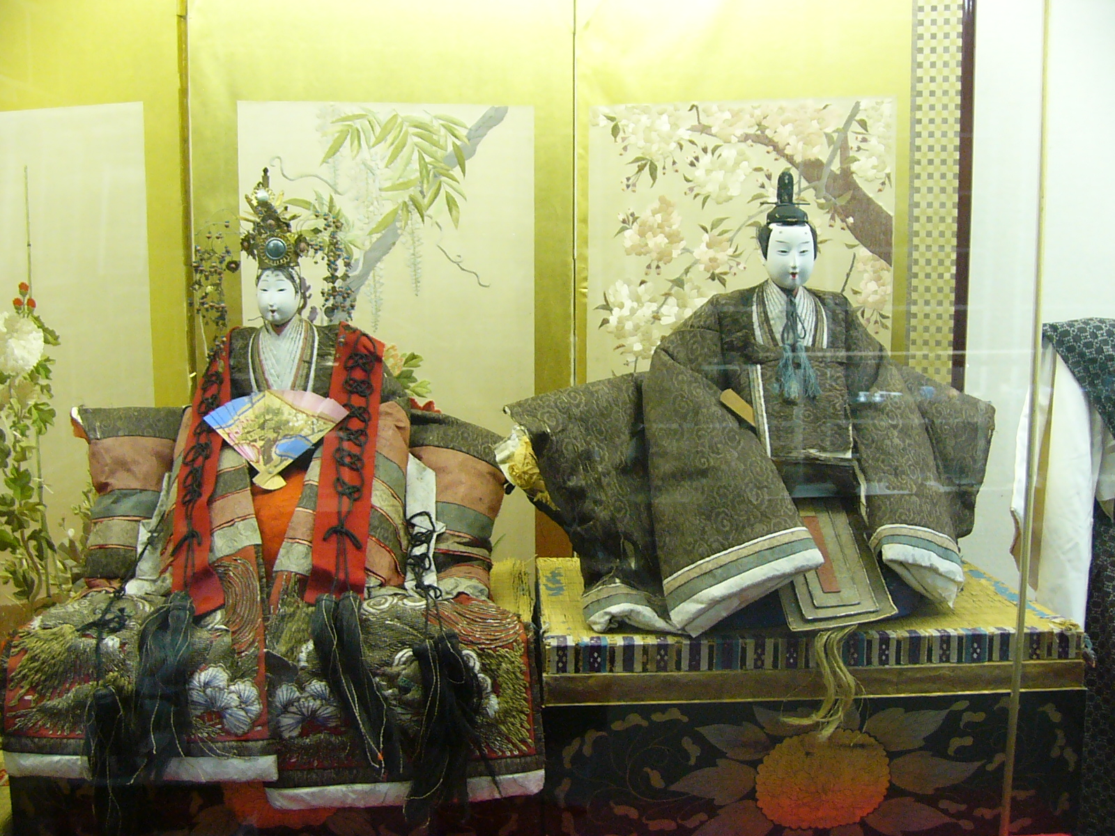 蔵に展示されていた、江戸時代の雛人形。今のものとだいぶ雰囲気が違います。女雛、髪の毛結い上げてないんですね! 毛先だけ、垂らした先に付いてる。男雛のほうは、着物から中身が出てしまってました。何だろう、紙…?それとも藁…?