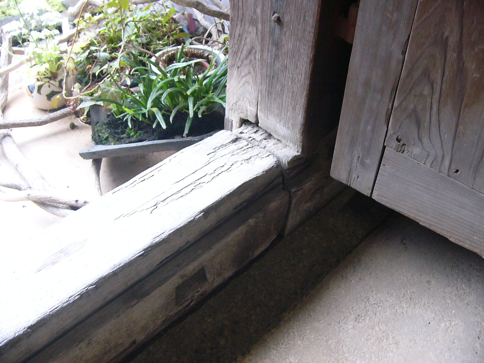 玄関(というか長屋門と言うのですね)は敷居が外せるようになってます。荷馬車などをそのまま奥へ通せるようにしてあるんだとか。母屋の入口も、そういったときに全開にできるようになっていました。しかも、普段使い用の人間サイズの扉も付いてた。ちょうど、ペットOK物件の人間用のドアに猫用のドアがついてるような感じ。