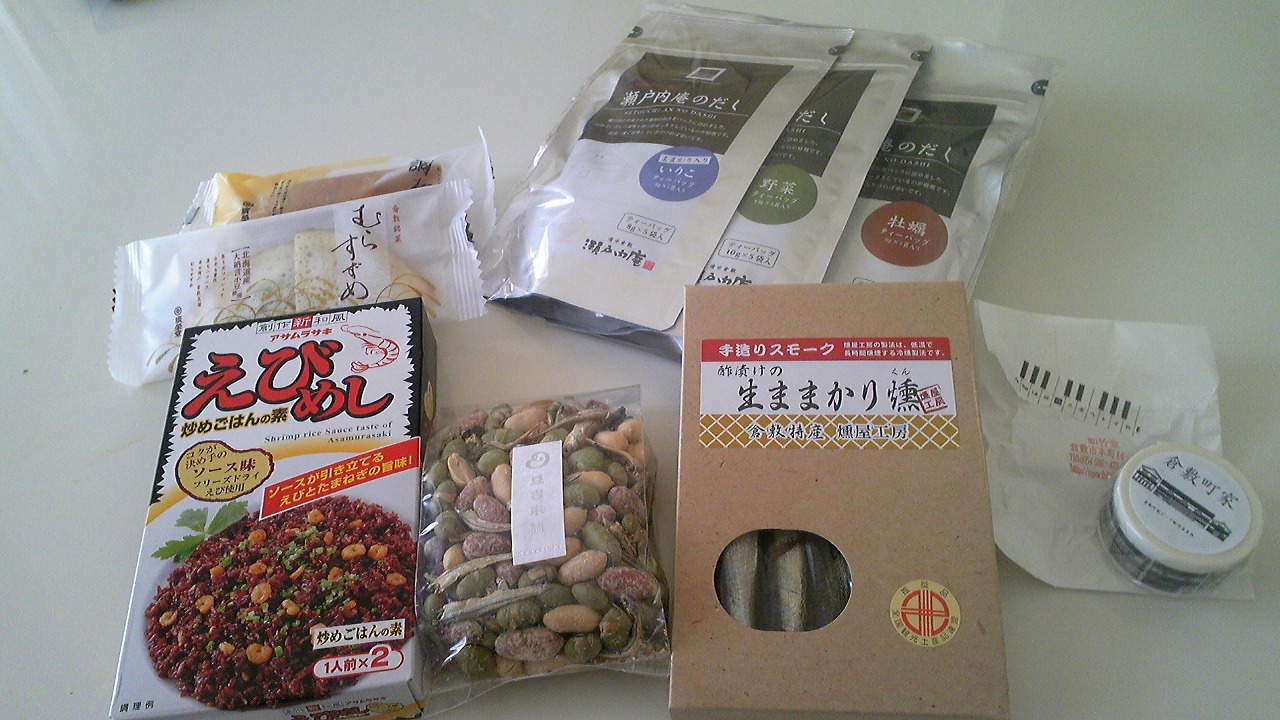 美観地区入口近くに、出汁の専門店があって、そこの店先で牡蠣の出汁を試飲させてもらったのですが、これのおいしいことおいしいこと! ティーパック型になってるから簡単に出汁が取れるし、袋開いてそのまま粉末を料理に使ってもOKだそう。野菜出汁、いりこ出汁とセットになっているものがあったので、それを買いました。あと、ままかりの燻製! 燻製は珍しいかな、と思って。