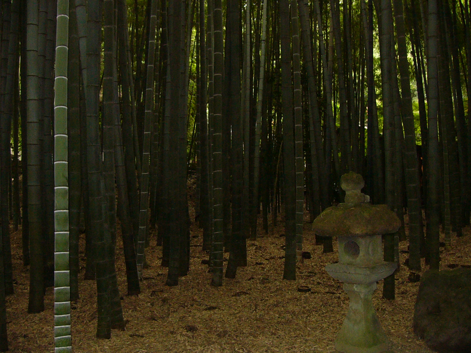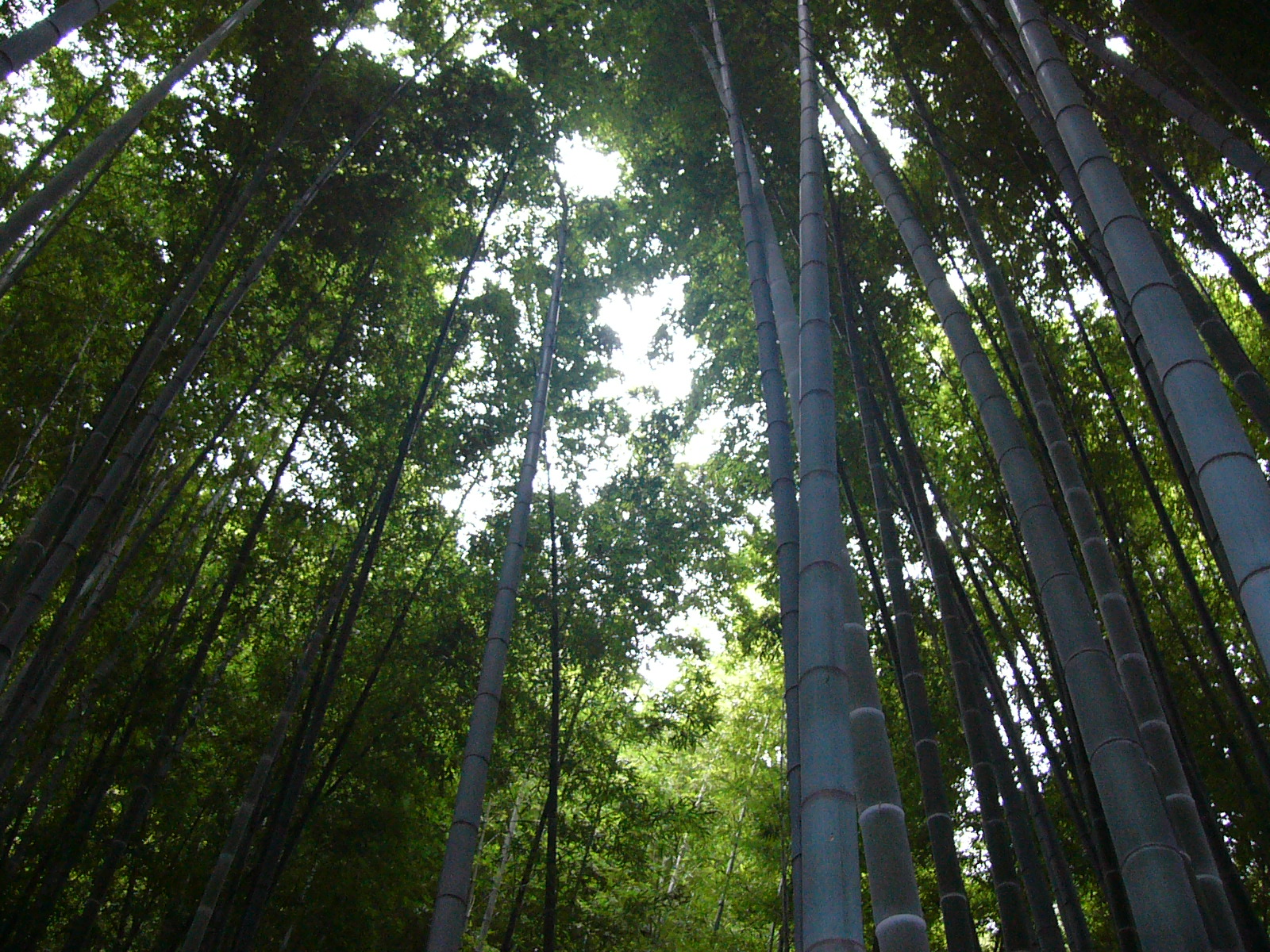 ぶっとい孟宗竹が、一面に生えてます。竹林の中はひんやりしていて、青みがかった薄闇です。見上げてもキレイ。