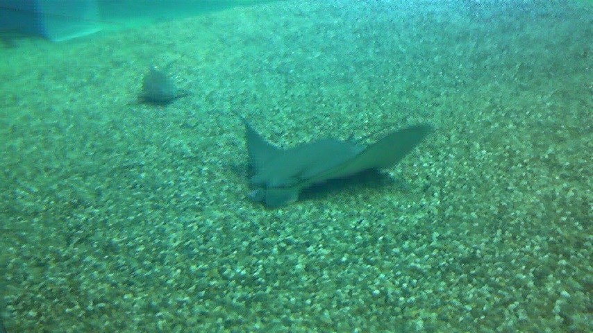 それからエイね。メインの大水槽なんだけど、館内をぶち抜く形に設置されてるから、上の方と下の方で魚の種類と行動が違うの。一番底でじっと見てたら、エイがガバッと口開けて海底を漁る様子がよく見られて、とても面白かったです。
