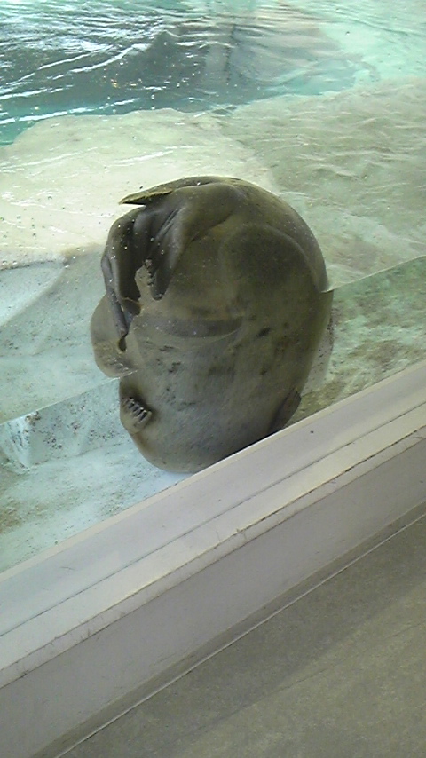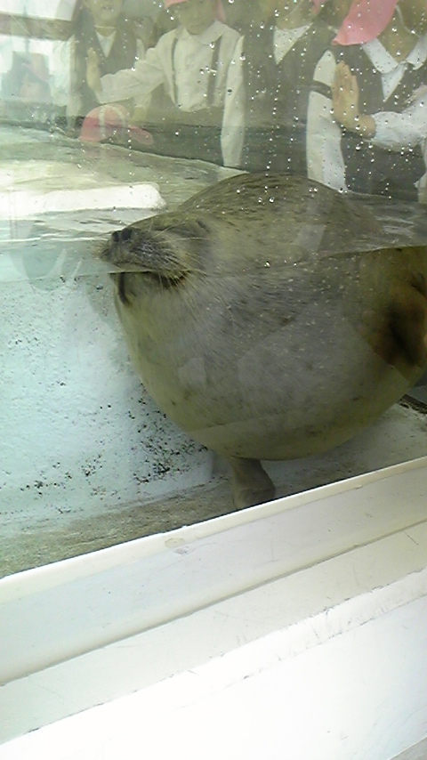 それから、ワモンアザラシの水槽。水槽の角のところで、偽岩に頭を埋めて動かないのが一頭いまして…通りかかった飼育員のお姉さんに聞いてみたら、「あの子はアラレちゃんって言って、ああやって狭いところで寝るのが好きなんですよ~、具合が悪いわけではないので安心してください~」だって。幼稚園児たちも心配そうに水槽に張り付いてたんですが、そうこうしてるうちにアラレちゃんは目を覚ましてしまったのでした。騒いでごめんねww