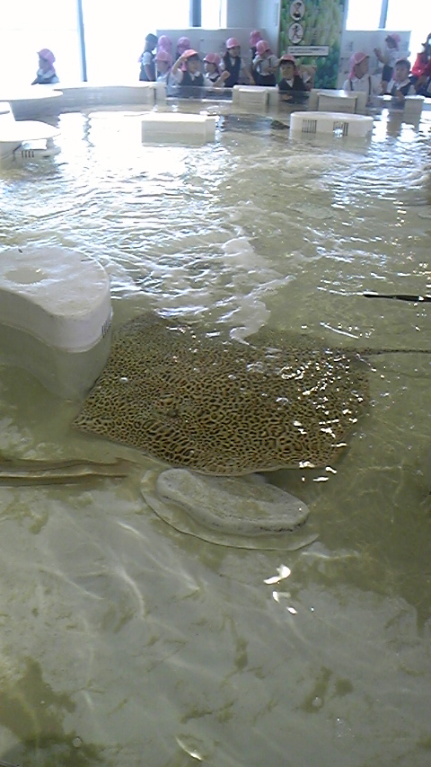 幼稚園児たちがキャーッってなってるのに紛れて、触ってきましたw もちろん大人しい性質の生き物ばかりなんだけど、紀章柄のエイがいたので、写真撮ってきました。うーん、やはりガラケは残念。